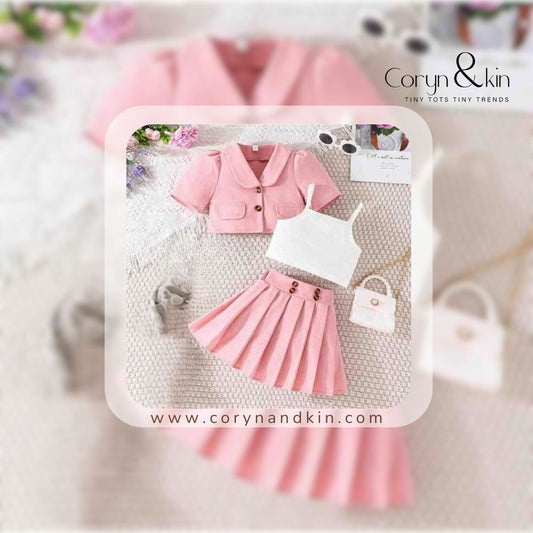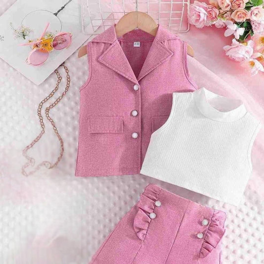 Trendy Pink Blazer Shorts Set for Girls | 3-Piece Sleeveless Outfit for 3–7 Years